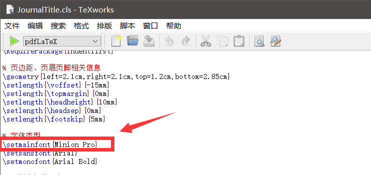 3.找到 \setmainfont{} 如图, 这里定义的文章的主要使用字体类型。图中表示的是文章默认的文本、加粗、斜体字体都默认为Minion Pro。