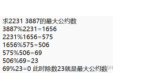 若用函数gcd(a,b)来表示,即gcd(a,b)=gcd(b,a%b),我们可以这样理解:3887 2231和2231 1656的最大公约数是相等的,依次类推、重复操作。用表达式可以这样来表示:gcd(3887,2231)=gcd(2231,1656)=gcd(1656,575),直到最后到底gcd(a,b)=gcd(c,0),即gcd(3887,2231)=gcd(23,0)。这里的c为a和b的最大公约数。