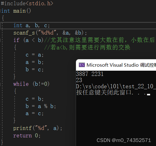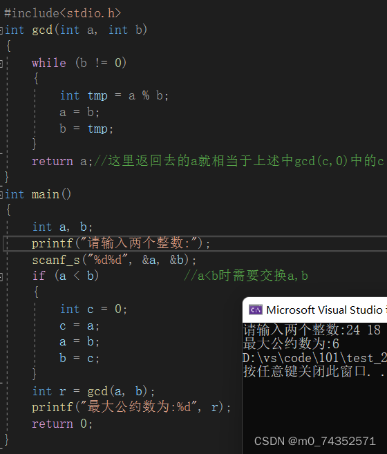 代码中的a就相当于上述gcd(a,b)=gcd(c,0)中的c。当然还有利用此原理的其他写法,不过是大同小异,这里就不一一列举了。这里的if语句其实是多余的,因为通过辗转相除完全可以实现两数之间的互换。