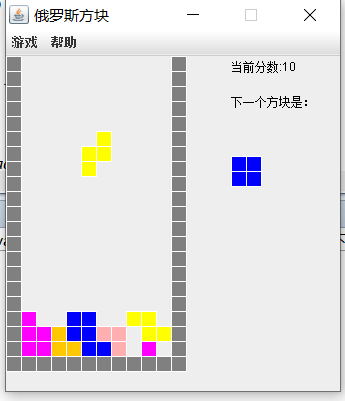 // 生成新方块public void newBlock() {// 如果当前没有下一方块 (游戏刚开局,生成当前方块和下一方块)if (nextBlockType == -1 && nextTurnState == -1) {blockType = (int) (Math.random() * 1000) % 7;turnState = (int) (Math.random() * 1000) % 4;nextBlockType = (int) (Math.random() * 1000) % 7;nextTurnState = (int) (Math.random() * 1000) % 4;} else {// 已有下一方块blockType = nextBlockType;turnState = nextTurnState;nextBlockType = (int) (Math.random() * 1000) % 7;nextTurnState = (int) (Math.random() * 1000) % 4;}x = 4;y = 0;// 屏幕上方中央if (gameover(x, y) == 1) {// 游戏结束newMap();drawWall();score = 0;JOptionPane.showMessageDialog(null, "GAME OVER!");}}