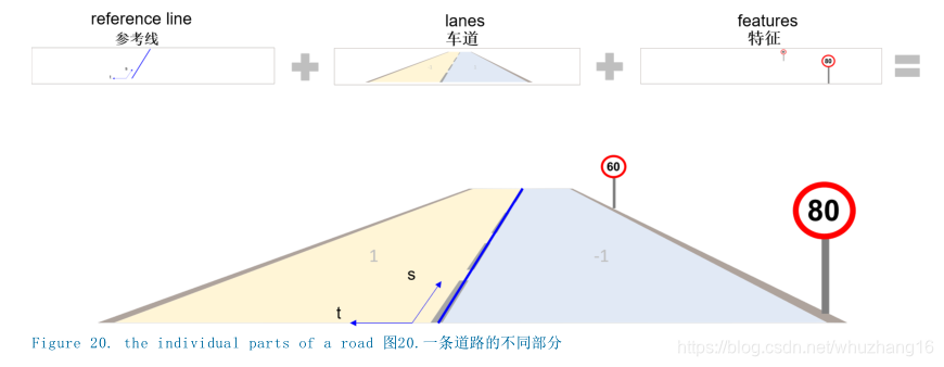 图20展示了OpenDRIVE中一条道路的不同部分。