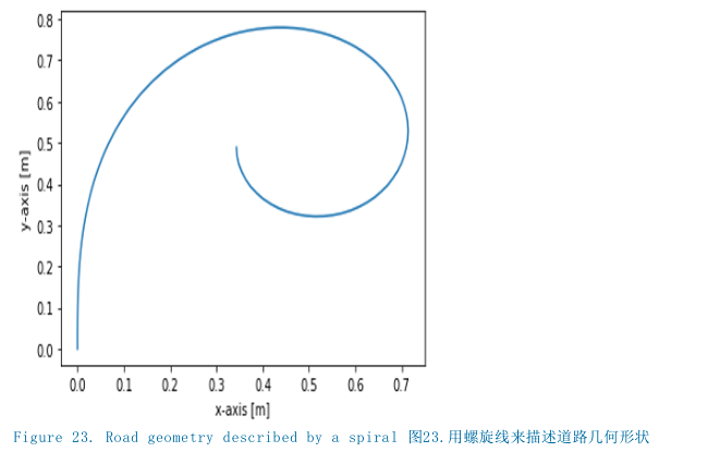 如图23所示,螺旋线是一条描述参考线变化曲率的回旋曲线。螺旋线可被用来描述曲率在<line>到<arc>连贯的转换。