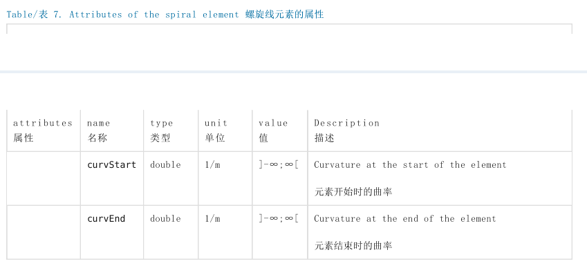 螺旋线是以起始位置的曲率(@curvStart)和结束位置的曲率(@curvEnd)为特征。沿着螺旋线的弧形长度(见 <geometry> 元素@length),曲率从头至尾呈线性。