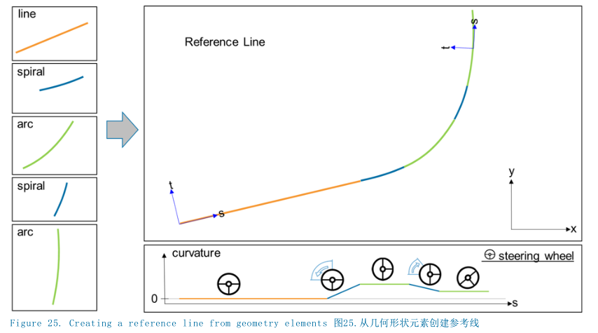 道路的走向可以是多种多样的,可以是空旷地面上的直线、高速公路上细长的弯道、亦或山区狭窄的转弯。为从数学角度对所有这些道路线进行正确建模,OpenDRIVE提供了多种几何形状元素。 图19展示了五种定义道路参考线几何形状的可行方式: