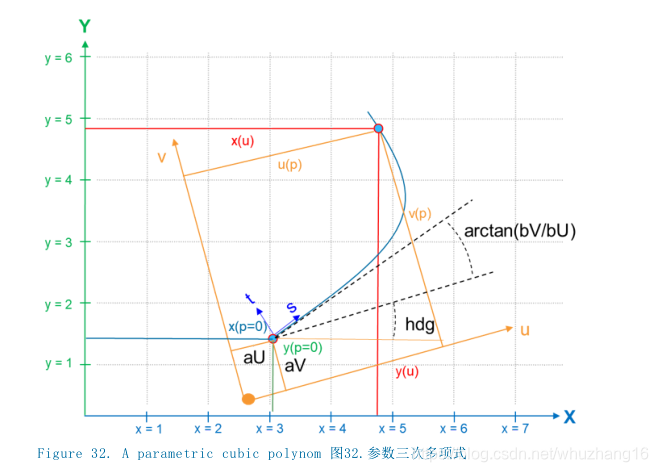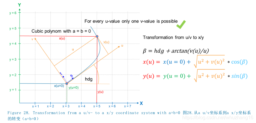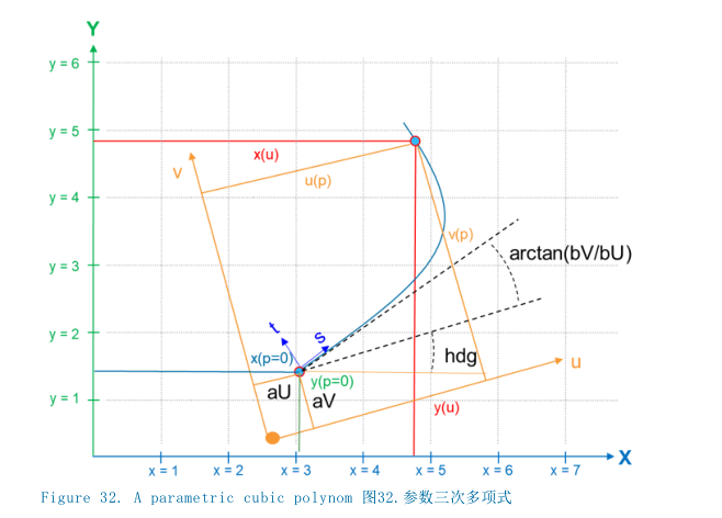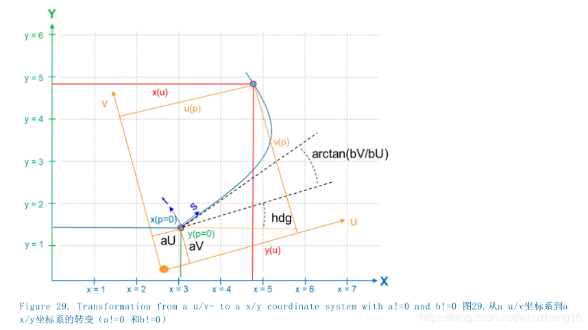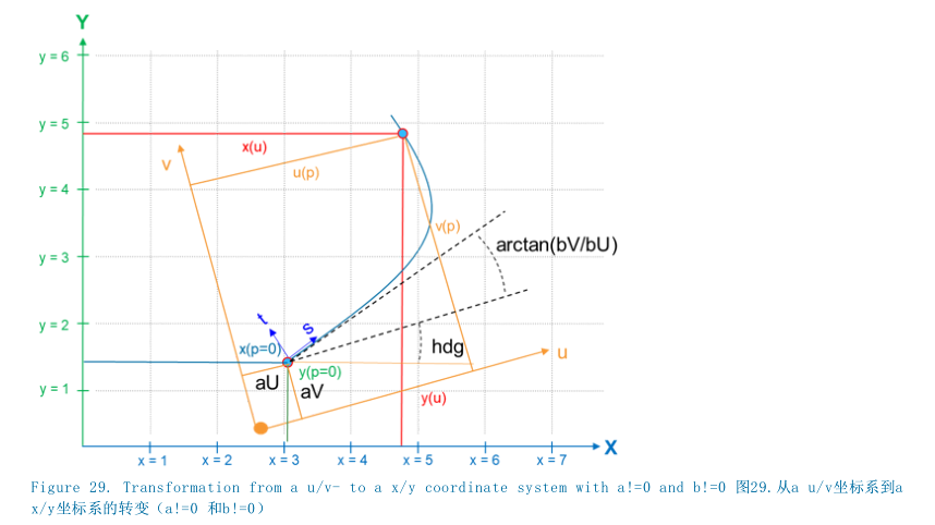 考虑到 <geometry> 元素中说明的位移和旋转参数@a、@b、(@x,@y) 和@hdg,在给定的u坐标上最终的x/y曲线位置如图29所示。