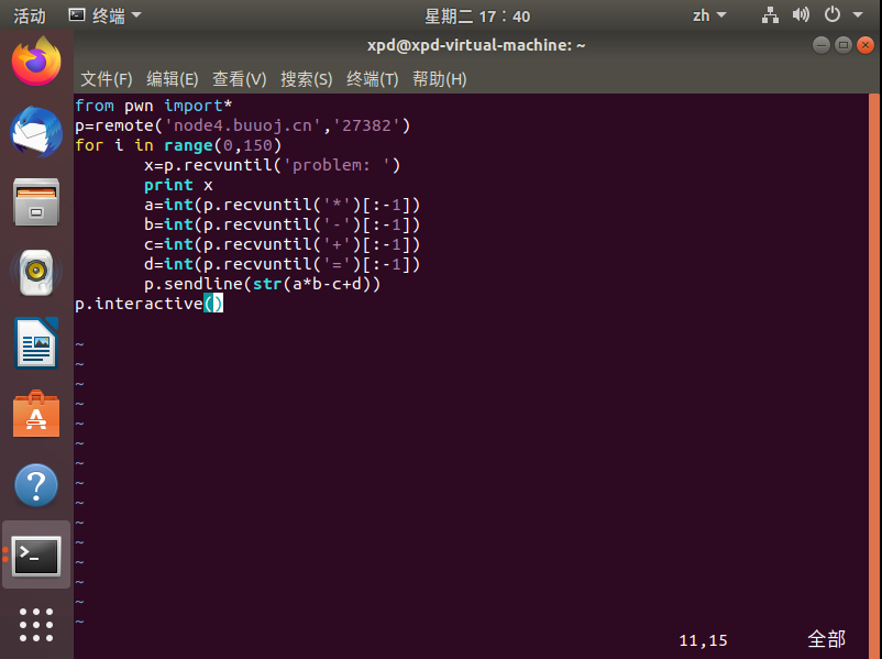 逻辑很简单,flag应该容易拿。我们可以使用pwntools的recvuntil方法来获取算式的参数,自动计算之后反弹,实现自动的150次计算。