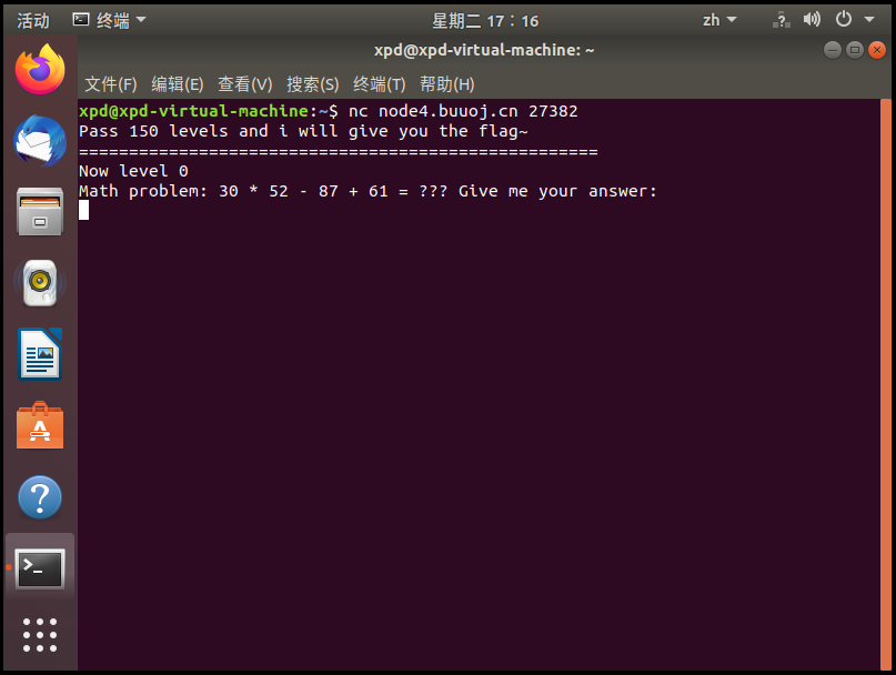 开启靶机连接环境。题目给出了一个算式,但是算不了几秒就退出了。