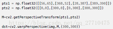 OpenCV提供两个变换函数:cv2.warpAffine和cv2.warpPerspective。第一个接收函数为2*3的变换矩阵;第二个接收参数为3*3的变换矩阵。