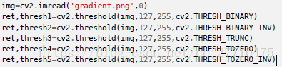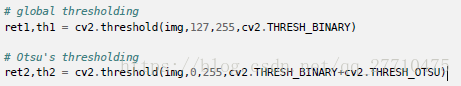 cv2.threshold() 参数:img+对像素值进行分类的阈值+高于阈值时应被赋予的新的像素值+不同的阈值方法。