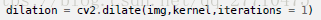与腐蚀相反,与卷积核对应的原图像的像素值中只要有一个是1,中心元素的像素值就是1。所以这个操作会增加图像中的白色区域(前景)。一般在去噪声时先用腐蚀再用膨胀。因为腐蚀在去掉白噪声的同时,也会使前景对象变小。所以我们再对他进行膨胀。这时噪声已经被去除了,不会再回来了,但是前景还在并会增加。膨胀也可以用来连接两个分开的物体。