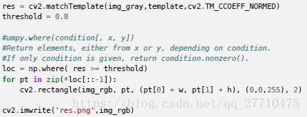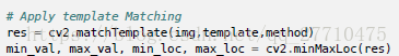 如果输入图像的大小是(WxH),模板的大小是(wxh),输出的结果的大小就是(W-w+1,H-h+1)。当你得到这幅图之后,就可以使用函数cv2.minMaxLoc() 来找到其中的最小值和最大值的位置了。第一个值为矩形左上角的点(位置),(w,h)为moban 模板矩形的宽和高。这个矩形就是找到的模板区域了。