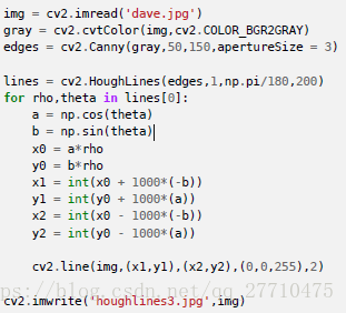 函数:cv2.HoughLines()。返回值就是(p;o)。p 的单位是像素,o 的单位是弧度。第一个参数是一个二值化图像,所以在进行霍夫变换之前要首先进行二值化,或者进行Canny 边缘检测。第二和第三个值分别代表p 和o 的精确度。第四个参数是阈值,只有累加其中的值高于阈值时才被认为是一条直线,也可以把它看成能检测到的直线的最短长度(以像素点为单位)。