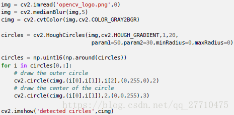 一个圆环需要3个参数来确定。所以进行圆环霍夫变换的累加器必须是3 维的,这样的话效率就会很低。所以OpenCV 用来一个比较巧妙的办法,霍夫梯度法,它可以使用边界的梯度信息。