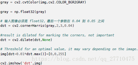 Open 中的函数cv2.cornerHarris() 可以用来进行角点检测。参数:img - 数据类型为float32 的输入图像。• blockSize - 角点检测中要考虑的领域大小。• ksize - Sobel 求导中使用的窗口大小。• k - Harris 角点检测方程中的自由参数,取值参数为[0,04,0.06].