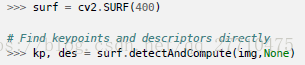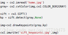 函数sift.detect() 可以在图像中找到关键点。如果你只想在图像中的一个区域搜索的话,也可以创建一个掩模图像作为参数使用。返回的关键点是一个带有很多不同属性的特殊结构体,这些属性中包含它的坐标(x,y),有意义的邻域大小,确定其方向的角度等。