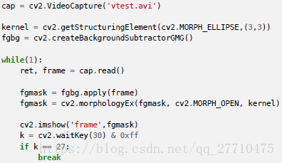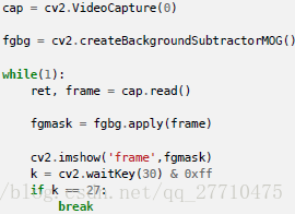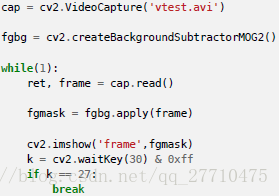 需要使用函数:cv2.createBackgroundSubtractorMOG()创建一个背景对象。这个函数有些可选参数,比如要进行建模场景的时间长度,高斯混合成分的数量,阈值等。将他们全部设置为默认值。然后在整个视频中需要使用backgroundsubtractor.apply() 就可以得到前景的掩模了。