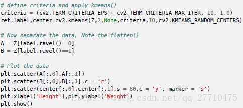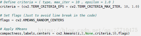 输入参数:1. samples: 应该是np.float32 类型的数据,每个特征应该放在一列。2. nclusters(K): 聚类的最终数目。3. criteria: 终止迭代的条件。当条件满足时,算法的迭代终止。它应该是一个含有3 个成员的元组,它们是(typw,max_iter,epsilon)。4. attempts: 使用不同的起始标记来执行算法的次数。算法会返回紧密度最好的标记。紧密度也会作为输出被返回。5. flags:用来设置如何选择起始重心。