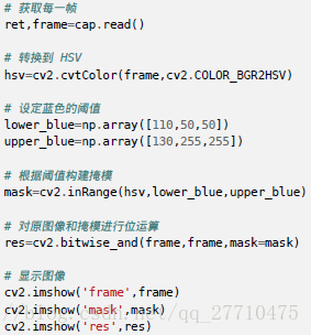 从视频中获取每一帧图像;将图像转换到HSV空间;设置HSV阈值到蓝色范围;获取蓝色物体。