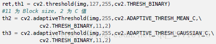 cv2.adaptiveThreshold() 参数:计算阈值的方法+blocksize邻域大小(计算阈值的区域大小)+C常数。
