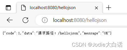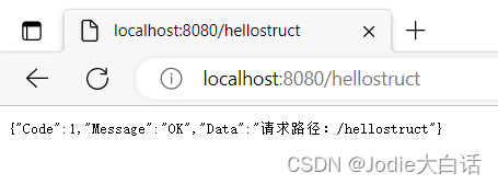 )func main() {engine := gin.Default()engine.GET("/hellojson", func(context *gin.Context) {path := "请求路径:" + context.FullPath()fmt.Println(path)//200:正常 404:NOT FOUND 500:内部错误//map类型context.JSON(200, map[string]interface{}{"code": 1,"message": "OK","data": path,})})//struct类型engine.GET("/hellostruct", func(context *gin.Context) {path := "请求路径:" + context.FullPath()fmt.Println(path)resp := Response{Code: 1, Message: "OK", Data: path}context.JSON(200, &resp)})engine.Run()