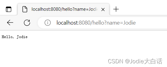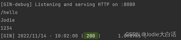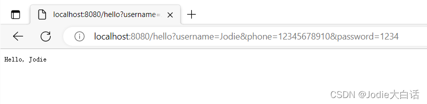)func main() {engine := gin.Default()//GET//http://localhost:8080/hello?username=Jodie&password=1234engine.GET("/hello", func(context *gin.Context) {fmt.Println(context.FullPath())var user Usererr := context.ShouldBindQuery(&user)if err != nil {log.Fatal(err.Error())return}fmt.Println(user.Username)fmt.Println(user.Password)context.Writer.Write([]byte("Hello, " + user.Username))})engine.Run()