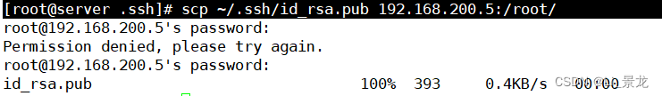 [root@server .ssh]# scp ~/.ssh/id_rsa.pub 192.168.200.5:/root/ //通过scp命令,将公钥拷贝到服务器的root目录下,输入对方的root密码