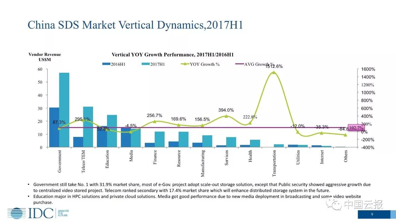 近日,IDC《2017年第二季度中国软件定义存储及超融合市场跟踪报告》的发布在国内软件定义存储(SDS)和超融合(HCI)市场激起涟漪。报告显示,从整体收入来看,2017年上半年,中国SDS和HCI市场保持迅猛增长势头。举例来说,2017年第二季度SDS比去年同期增长78.9%,收入达到1.09亿美元; 2017年第二季度HCI比去年同期增长58.2%,收入达到6360万美元;在整个存储市场中,SDS所占份额达到13.9%,而HCI也达到了9%。IDC认为,云与SDS、HCI成了存储市场发展的主要驱动力。