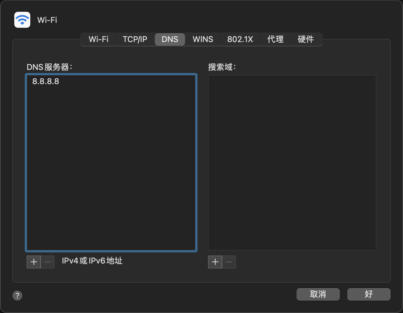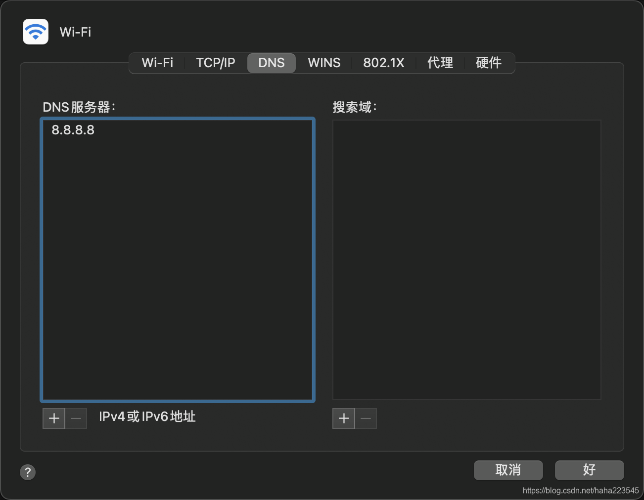 MAC 电脑查看 DNS 方式:系统偏好设置 -> 网络 -> 高级 -> NDS