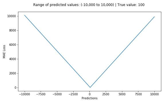 下图是MSE函数的图像,其中目标值是100,预测值的范围从-10000到10000,Y轴代表的MSE取值范围是从0到正无穷,并且在预测值为100处达到最小。