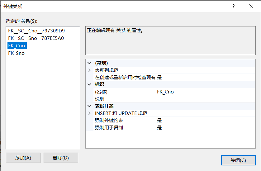 d.为SC表的Sno,Cno字段设置外键约束,约束名自己取,并允许级联删除与级联更新。若已存在外键约束,请先删除。