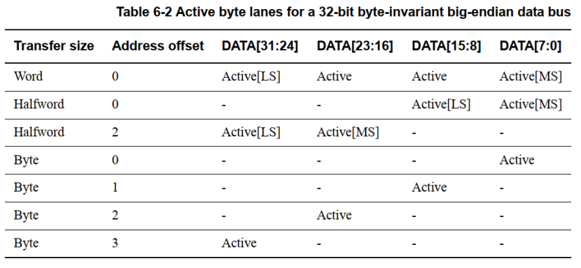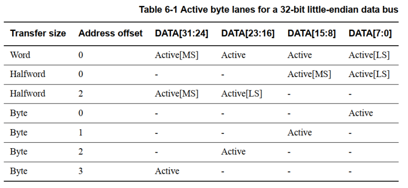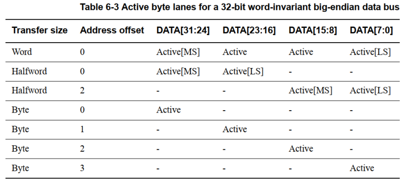对于小于总线宽度的传输,例如32位总线上的16位传输,主机只需要驱动适当的字节通道。从机从正确的字节通道中选择写数据。关于小端和大端系统中活跃的字节通道的详细信息,请参见第6-61页的Endianness。