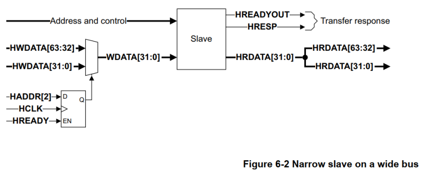 通过使用外部逻辑,预先设计或导入的从机可以适应在较窄的数据总线上工作。图6-3是在窄总线上实现的宽从机。