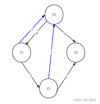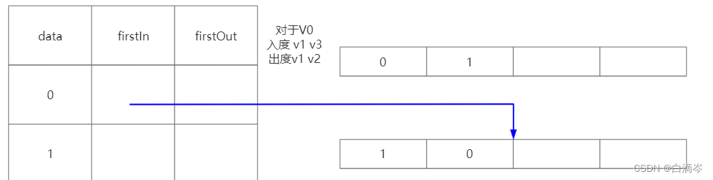 对于顶点集合的结构来说,firstIn应该指向V0的第一个入度节点,从逻辑上来说没有先后排序,但从代码上的步骤是遍历V0的所有的邻接点去判断,所以这里firstIn应该指向弧(V1,V0),如下图所示