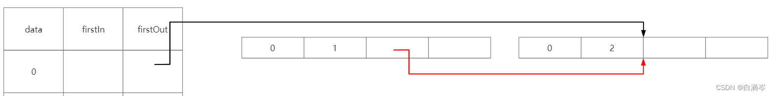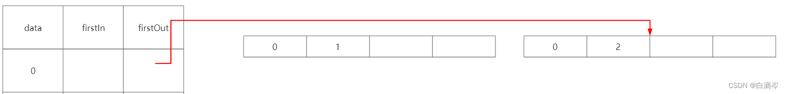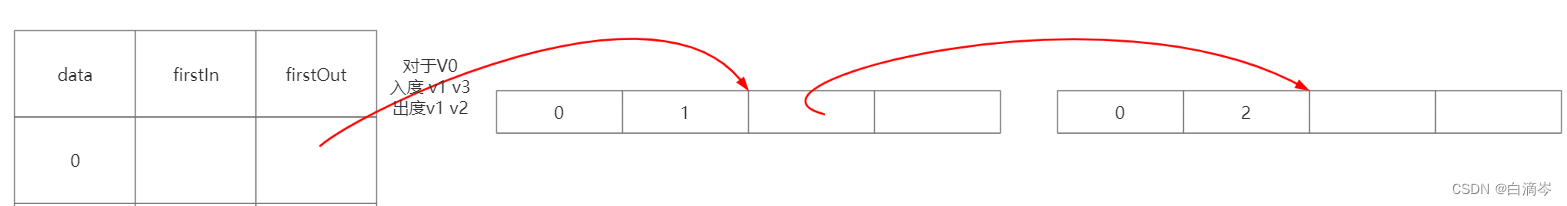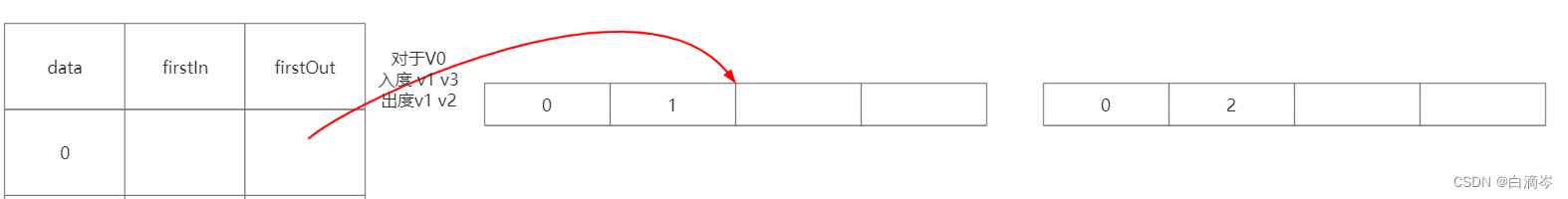 对于顶点集合的结构来说,firstOut应该指向V0的第一个出度节点,从逻辑上来说没有先后排序,但从代码上的步骤是遍历V0的所有的邻接点去判断,所以这里firstOut应该指向弧(V0,V1),如下图所示