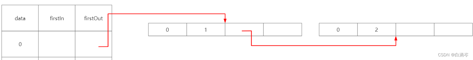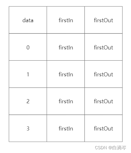 其中data是数据域,用于记录顶点的信息,而firstIn和firstOut是两个指针,指向的是以该节点为弧头(In)或弧尾(Out)的第一节点。