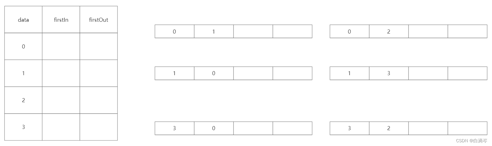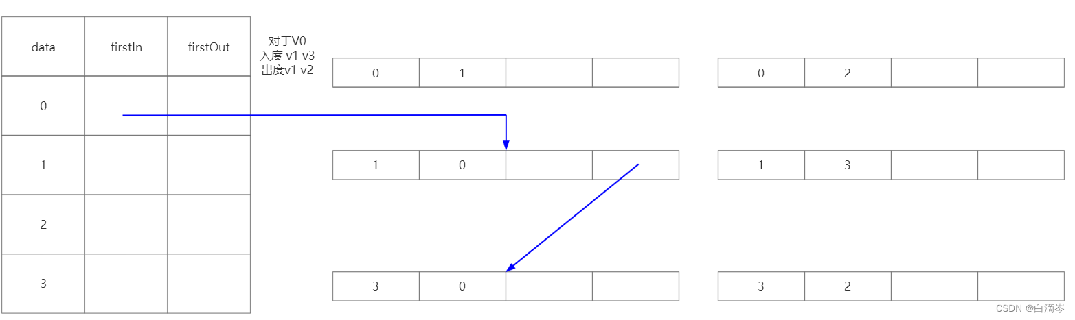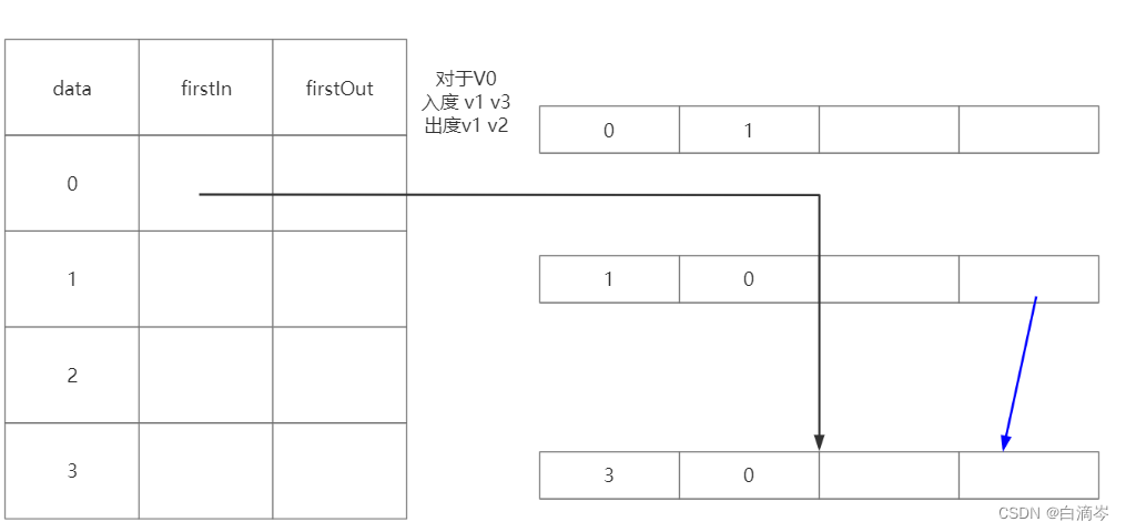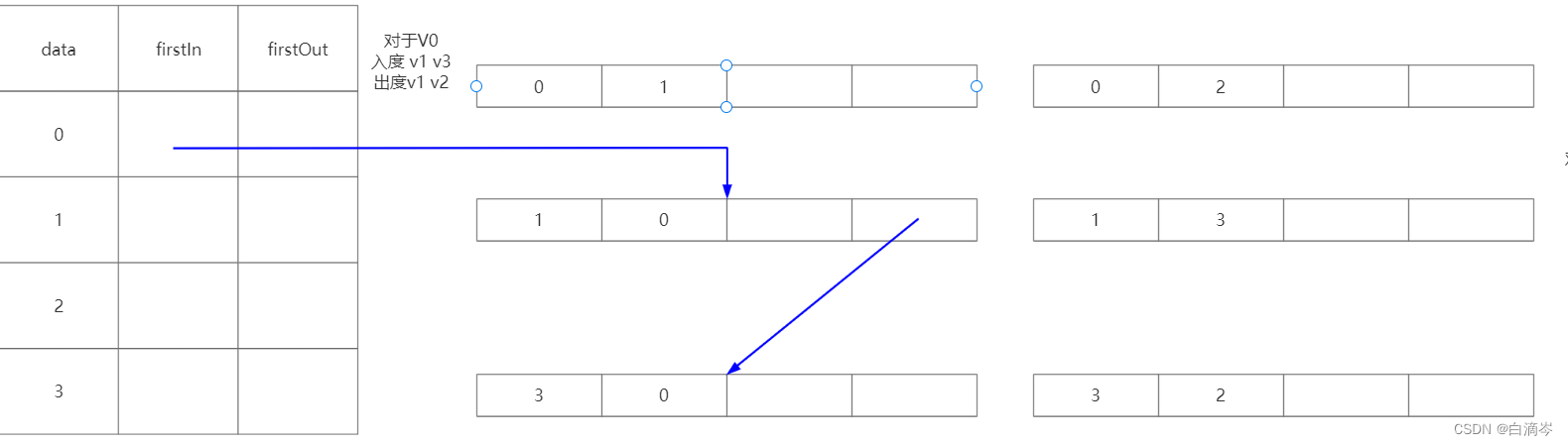 怎么理解这张图表呢?左边的图表表示的是从V0到V3的顶点的集合,data是V0到V3的值;右边的离散的表格代表的就是有向图中一条一条的弧,也就是每个顶点对应的弧的集合