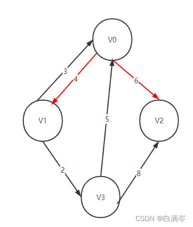 还是对于这样一个有向图,我们以节点V0为例,可以看到与V0有关的弧有四条,分别是:(V0,V1)、(V0,V2)、(V1,V0)、(V3,V0)因为这是一个有向图,所以我们应该以有向图的入度和出度的形式去观察V0节点,很明显(V0,V1)、(V0,V2)两条弧表示V0的出度,而(V1,V0)、(V3,V0)表示的是V0的入度