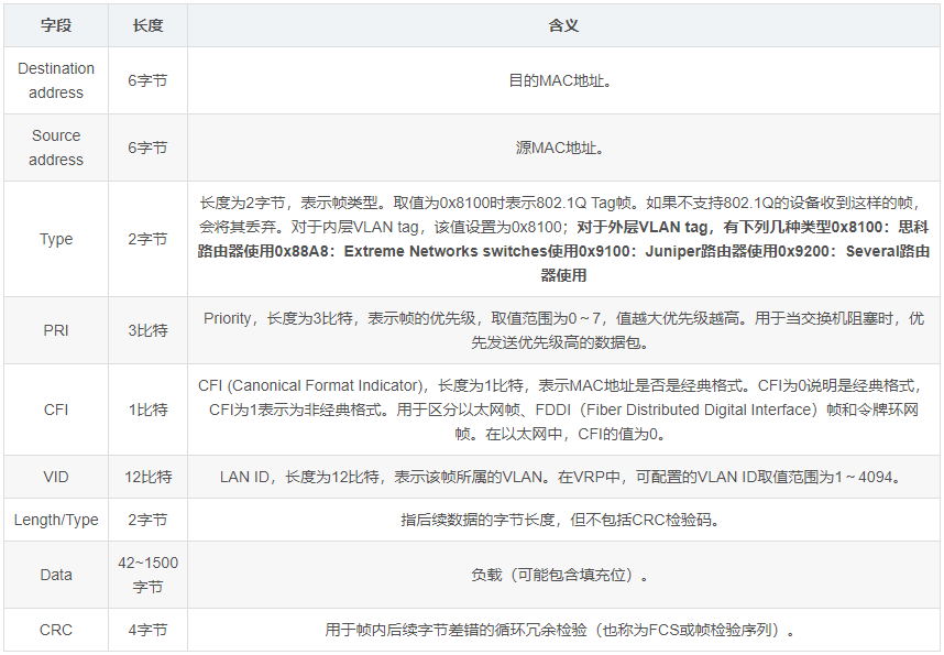 IEEE802.1Q协议定义的以太网帧的VLAN Tag。802.1Q Tag位于SA(Source Address)和Length/Type之间。通过检查对应的TPID值,设备可确定收到的帧承载的是运营商VLAN标记还是用户VLAN标记。接收到帧之后,设备将配置的TPID值与帧中TPID字段的值进行比较。如果二者匹配,则该帧承载的是对应的VLAN标记。例如,如果帧承载TPID值为0x8100的VLAN标记,而用户网络VLAN标记的TPID值配置为0x8200,设备将认为该帧没有用户VLAN标记。也就是说,设备认为该帧是Untagged报文。