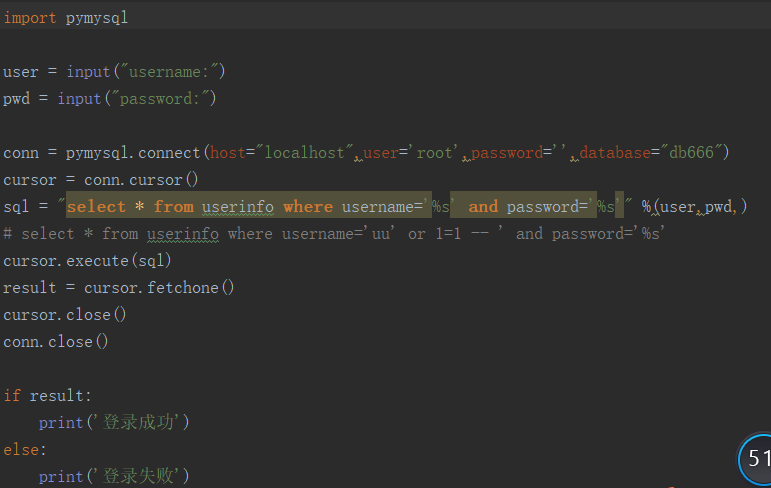 假设我们输入用户名和密码,然后登录数据库,在数据库中查找用户和密码是否存在,存在即登录成功,否则登录失败