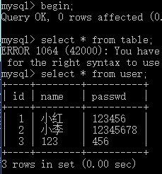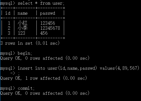 重新打开一个窗口登录,开启事务插入数据,并commit