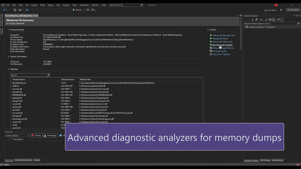 Preview 3 中的诊断分析器可用于内存转储,以识别 .NET 应用程序中的常见问题,用户能在短时间内找到复杂问题的根源。