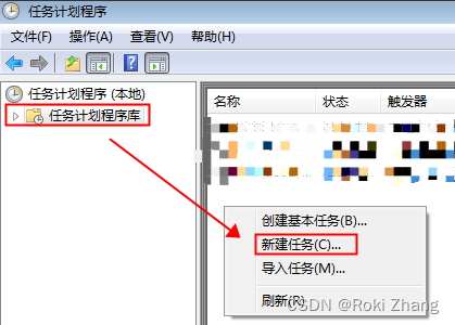 2. 点击任务计划程序库 => 在右边空白部分右击 => 新建任务
