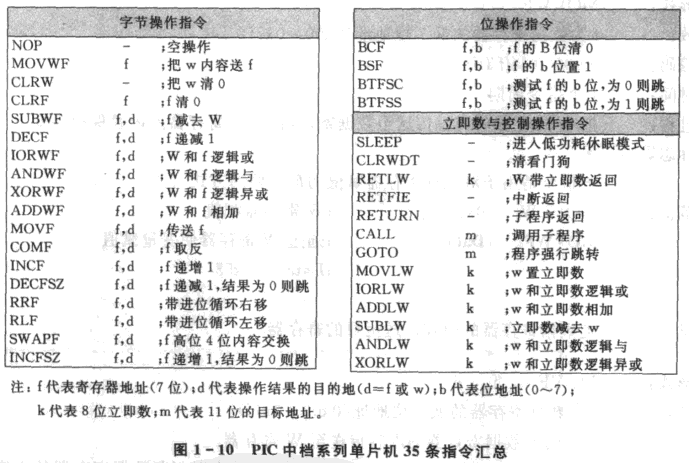 传统的单片机采用复杂指令集(Complex Instruction Set Computer, CISC)结构,通常有50~110条。而 PIC 采用精简指令集(Reduced Instruction Set Computer, RISC),其高中低档分别为58,35和33条
