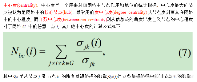 hub:核心节点。中心度/中心性最大的节点被认为是网络中的核心节点(hub)。中心性定义见2.2 中介中心性。