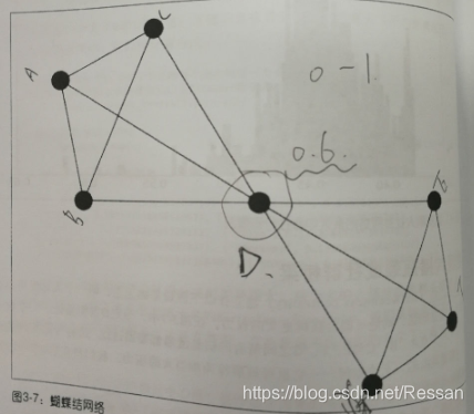 (2)聚类系数(clustering coefficient):网络中某一节点有k条边,即连接了k个节点,那么这k个节点之间实际存在的边数 与可能存在的边数最大值