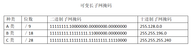 由此可见,可变长子网掩码跟不可变长子网掩码计算方法大同小异,就是在原先默认子网掩码的基础上多加几个“1”而已。