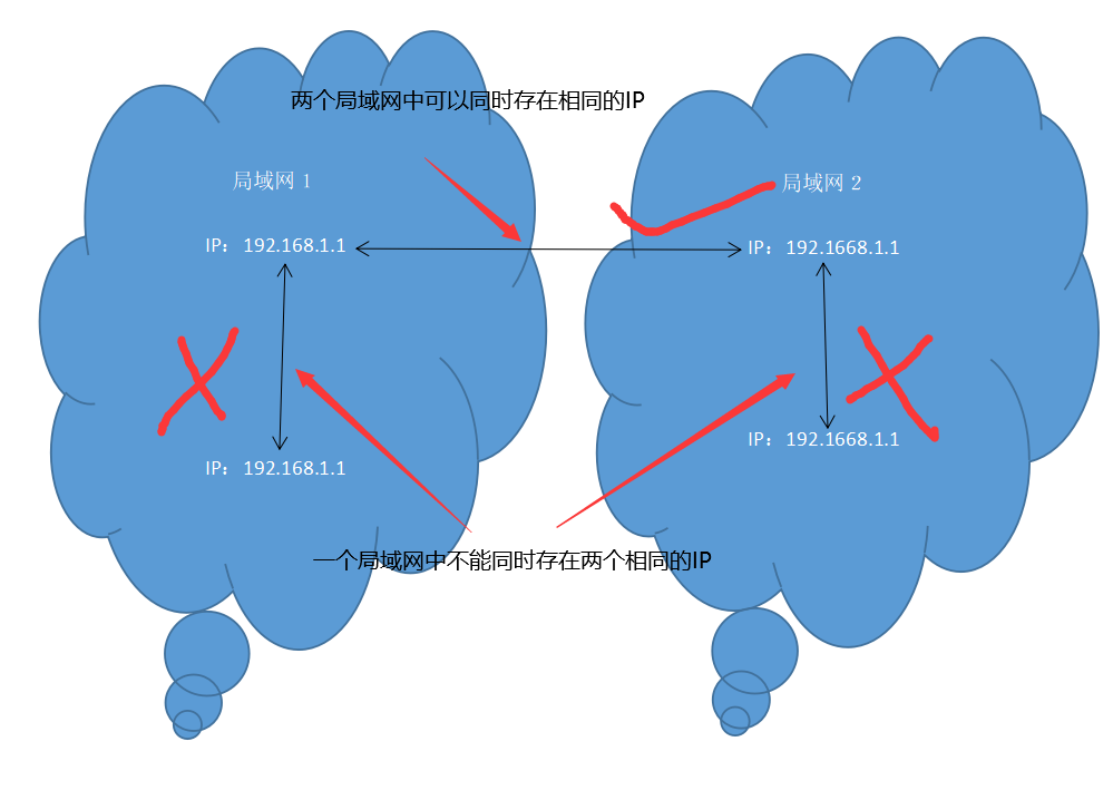 两个不同的局域网中,地址名称可以一样,但是同一个局域网内IP地址不能进行重复