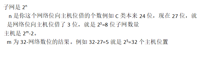 由上面例子可以得出:子网是2的当前网络位向主机位借的数量的次幂