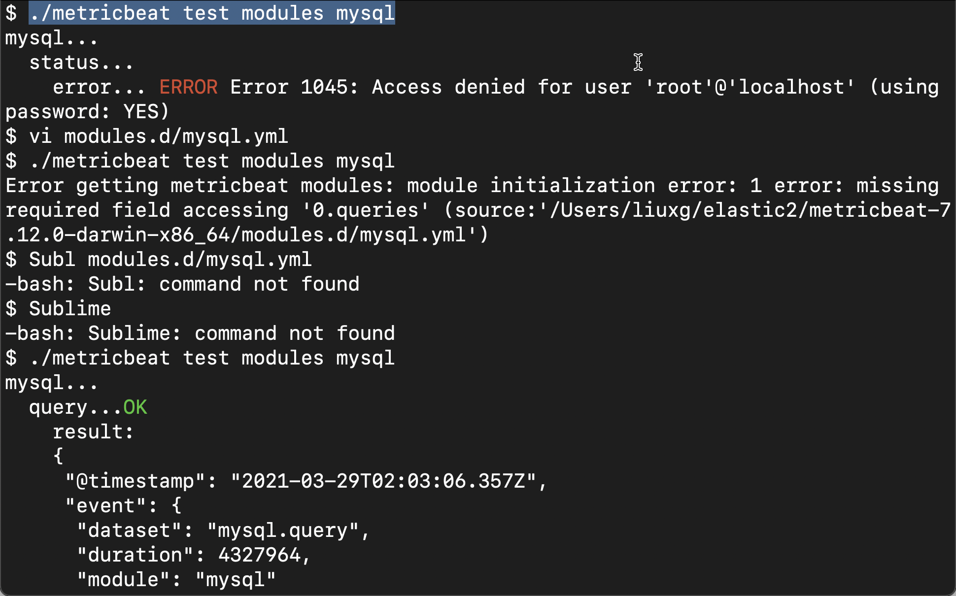 上面表示我们的测试是成功的。我们接下来启动 query metricset: