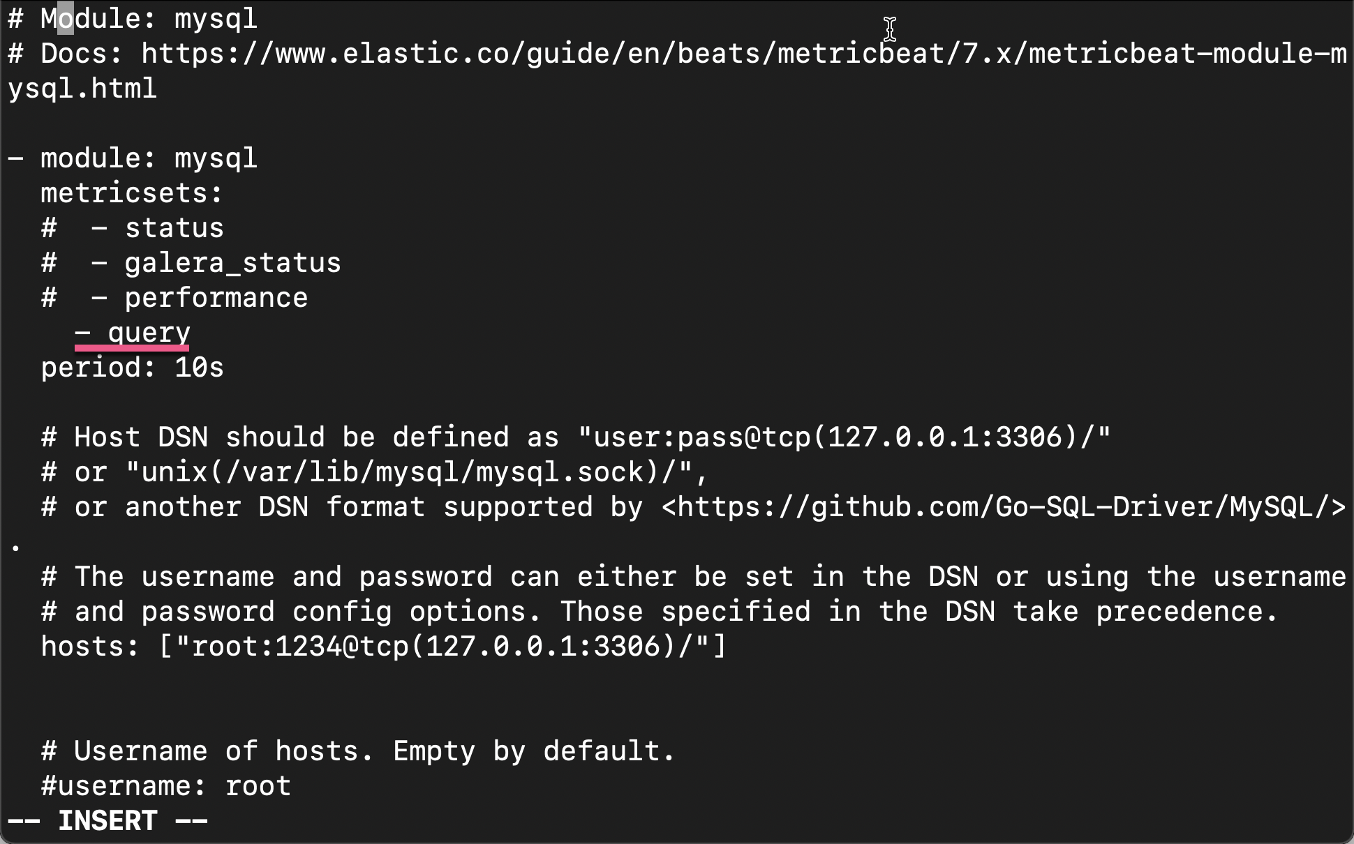 # Docs: https://www.elastic.co/guide/en/beats/metricbeat/7.x/metricbeat-module-mysql.html- module: mysqlmetricsets:- status# - galera_status# - performance# - queryperiod: 10s# Host DSN should be defined as "user:pass@tcp(127.0.0.1:3306)/"# or "unix(/var/lib/mysql/mysql.sock)/",# or another DSN format supported by <https://github.com/Go-SQL-Driver/MySQL/>.# The username and password can either be set in the DSN or using the username# and password config options. Those specified in the DSN take precedence.hosts: ["root:1234@tcp(127.0.0.1:3306)/"]# Username of hosts. Empty by default.#username: root# Password of hosts. Empty by default.#password: secret